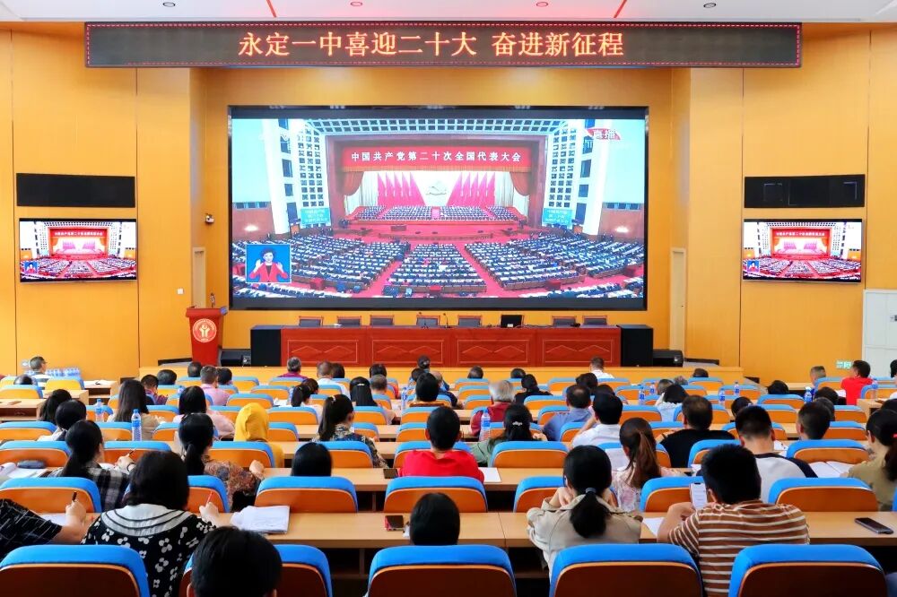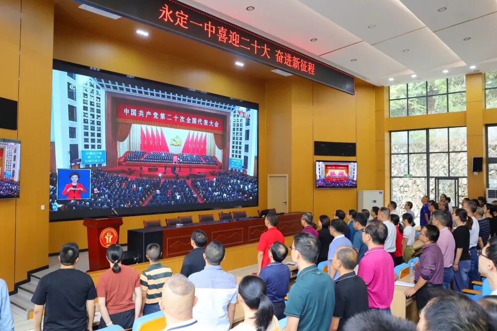10月16日上午9时50分,永定一中学术报告厅已是座无虚席,大家精神饱满。上午10时,中国共产党第二十次全国代表大会开幕。人民大会堂开幕式会场国歌奏响,全体教师起立,齐唱国歌。